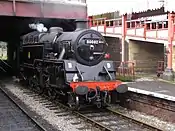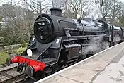 No. 75078 was withdrawn in 1966,[12] and sent to Barry scrapyard in South Wales where it languished for five and a half years until it left to take up residence at the KWVR in 1972, where it has remained ever since. Returned to service in February 2015 after more than 16 years out of traffic.[13] Boiler ticket expires in 2024. |