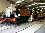 GN&SR Lined Ochre | Built for the Great Western Railway in September 1929 and worked at Neath shed in South Wales. At Nationalisation, it was at 87C shed – Danygraig, where it stayed until transfer to Carmarthen (87G) and finally to Pontypool Road (86G).[6] Sold to London Transport in July 1963,[6] numbered L89 and repainted in LT maroon livery. No. 5775 moved to KWVR in January 1970[6] where it starred as the locomotive that hauled the Old Gentleman's train in 'The Railway Children' film . In 2014, it was placed on loan to the National Railway Museum following cosmetic restoration at Shildon into its 'Railway Children' livery for the 45th anniversary of the film, returning to the line in November 2016.[17] It is now on display in the museum at Oxenhope. |