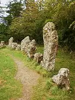Since the late 19th century, the monument has been in part a reconstruction. In 1882, the owner of the site re-erected around a third of the stones that had previously fallen. Some were moved from their original positions.[27] Using documentary evidence and lichen growth analysis, archaeologists have established that around that time, several new stones were added to the circle in order to fill in gaps where the original stone had been lost or destroyed. Lambrick doubted that more than two of those currently standing were modern additions. Four of the other, smaller additions were stolen by vandals in the 20th century.[28]