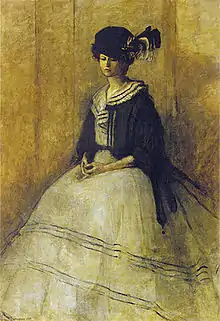 The most widely observed influence on Brooks's painting is that of James McNeill Whistler, whose subdued palette probably inspired her to adopt a monotone color scheme with accents of tinted pigments because through this technique she could suggest a classical restraint and create tensions that were modulated by shape, texture, and variations of shading throughout her canvases. She may have been introduced to Whistler's work by the art collector Charles Lang Freer, whom she met on Capri around 1899, and who bought one of her early works.[62] Brooks said she "wondered at the magic subtlety of [Whistler's] tones" but thought his 'symphonies' lacked the corresponding subtlety of expression.[63] One 1920 portrait may take its composition from a painting by Whistler. While the poses are almost identical, Brooks removes the little girl and all the details of Whistler's domestic scene, leaving only Borgatti and her piano—an image of an artist completely focused on her art.[64]