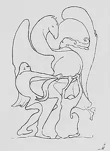 In 1930, while laid up with a sprained leg, Brooks began a series of more than 100 drawings of humans, angels, demons, animals, and monsters, all formed out of continuous curved lines. She said that when she started a line she did not know where it would go, and that the drawings "evolve [d] from the subconscious...[w]ithout premeditation."[49] Brooks was writing her unpublished memoir No Pleasant Memories at the same time she began this series of drawings. Critics have interpreted them as exploring the continuing effect of her childhood on her—a theme expressed even in the symbol she used to sign them, a wing on a spring.[50] Decades later, at 85, she said, "My dead mother gets between me and life."[51]