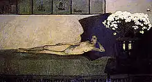 Although they broke up in 1914, Brooks painted Rubinstein more often than any other subject; for Brooks, Rubinstein's "fragile and androgynous beauty"[21] represented an aesthetic ideal. The earliest of these paintings are a series of allegorical nudes. In The Crossing (also exhibited as The Dead Woman), Rubinstein appears to be in a coma, stretched out on a white bed or bier against a black void variously interpreted as death or floating in spent sexual satisfaction on Brooks' symbolic wing;[2] in Spring, she is depicted as a pagan Madonna strewing flowers on the ground in a grassy meadow. When Rubinstein starred in D'Annunzio's play The Martyrdom of Saint Sebastian, Brooks painted her as a blonde Saint Sebastian—tied to a post, being shot with an arrow by a masked dwarf standing on a table. The dwarf is a satiric representation of D'Annunzio.[2][22]