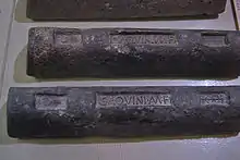 The most common fuel by far for smelting and forging operations, as well as heating purposes, was wood and particularly charcoal, which is nearly twice as efficient.[2] In addition, coal was mined in some regions to a fairly large extent: Almost all major coalfields in Roman Britain were exploited by the late 2nd century AD, and a lively trade along the English North Sea coast developed, which extended to the continental Rhineland, where bituminous coal was already used for the smelting of iron ore.[3] The annual iron production at Populonia alone accounted for an estimated 2,000[4] to 10,000 tons.[5]