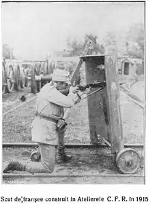 Between 1914 and 1916, 59 Romanian factories produced 400,000 artillery rounds, 70 million bullets, 1,500 caissons and 332 gun carriages. Grenades were also manufactured, with three factories producing 1.5 tons of explosives daily.[31] The 332 gun carriages were produced in order to convert Romania's 53 mm and 57 mm Fahrpanzer fortress guns into field artillery.[32] Some of the 57 mm guns were converted into anti-aircraft guns using a carriage designed by the Romanian General Ștefan Burileanu.[33]