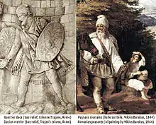 The form and ornametics of the contemporary garments preserved a part of the language of signs and symbols specific to the mythical thinking of those times. Thus, the first testimonies about Romanian traditional port are set in stone, on Tropaeum Traiani monument in Adamclisi and Trajan's Column in Rome. For example, women portraits carved on Trajan's Column after the Dacian wars provide information about their clothing. Dacian women wore shirts rippled at the neck related to the Romanian ie. Sleeves were either long and wide or short. The dress was long to the ground, over which sometimes was attached a wide draped mantle. In the feet they wore leather sandals in summer and fur sandals in winter.[6]