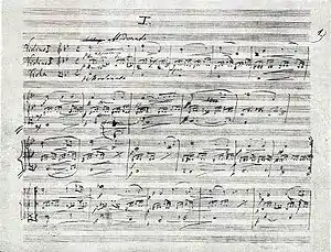 The composer's family was living in that time in Prague 2, at 564 Žitná Street, in the same house as Dvořák's mother-in-law. She hired out a room to a young chemistry student, Josef Kruis. Kruis was also an amateur violinist who studied the violin with Jan Pelikán, a member of the orchestra of the National Theatre in Prague.[1] They often played violin duets together. Dvořák, a viola player, heard them and got the idea to compose a new chamber work for two violins and viola in order to play with them.[1] The resulting composition was the Terzetto in C major, Op. 74, B. 148, composed from 7 to 14 January 1887. It was, however, too difficult for Kruis, and Dvořák therefore composed another trio, but considerably simpler.[1] The second trio, Miniatures, was written in four movements, which he titled: "Cavatina", "Capriccio", "Romance" and "Elegy" ("Ballad"). In the letter dated 18 January 1887 to his German publisher Simrock, Dvořák stated: "I am writing little miniatures – just imagine – for two violins and viola, and I enjoy the work as much as if I were writing a large symphony – what do you say to that? Of course, they are meant rather for amateurs, but didn't Beethoven and Schumann also express themselves sometimes with quite simple means – and how?..."[1] Though he was apparently satisfied with this version of the trio, he nevertheless immediately began to rearrange it for violin and piano. He called the new version Romantic Pieces, Op. 75. The only date appears at the end of the manuscript – 25 January 1887. Dvořák later completely forgot about the existence of the trio, and years later in 1901 explained to Simrock that "...what is supposed to be a trio...cannot be the Romantic Pieces".[1] Dvořák's original manuscript of the trio version (and Kruis' copy of individual parts) was only rediscovered in 1938, and it was proven that he himself was mistaken.[1]