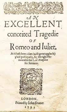Shakespeare's Romeo and Juliet was published in two quarto editions prior to the publication of the First Folio of 1623. These are referred to as Q1 and Q2. The first printed edition, Q1, appeared in early 1597, printed by John Danter. Because its text contains numerous differences from the later editions, it is labelled a so-called 'bad quarto'; the 20th-century editor T. J. B. Spencer described it as "a detestable text, probably a reconstruction of the play from the imperfect memories of one or two of the actors", suggesting that it had been pirated for publication.[30] An alternative explanation for Q1's shortcomings is that the play (like many others of the time) may have been heavily edited before performance by the playing company.[31] However, "the theory, formulated by [Alfred] Pollard," that the 'bad quarto' was "reconstructed from memory by some of the actors is now under attack. Alternative theories are that some or all of 'the bad quartos' are early versions by Shakespeare or abbreviations made either for Shakespeare's company or for other companies."[32] In any event, its appearance in early 1597 makes 1596 the latest possible date for the play's composition.[27]