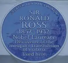 Sir Ronald Ross KCB KCMG FRS FRCS[1][2] (13 May 1857 – 16 September 1932) was a British medical doctor who received the Nobel Prize for Physiology or Medicine in 1902 for his work on the transmission of malaria, becoming the first British Nobel laureate, and the first born outside Europe. His discovery of the malarial parasite in the gastrointestinal tract of a mosquito in 1897 proved that malaria was transmitted by mosquitoes, and laid the foundation for the method of combating the disease. He was a polymath, writing a number of poems, published several novels, and composed songs. He was also an amateur artist and natural mathematician. He worked in the Indian Medical Service for 25 years. It was during his service that he made the groundbreaking medical discovery. After resigning from his service in India, he joined the faculty of Liverpool School of Tropical Medicine, and continued as Professor and Chairman of Tropical Medicine of the institute for 10 years. In 1926 he became Director-in-Chief of the Ross Institute and Hospital for Tropical Diseases, which was established in honour of his works. He remained there until his death.[3][4]