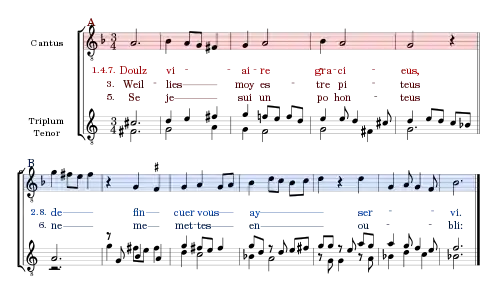 In its simplest and shortest form, the rondeau simple, each of the structural parts is a single verse, leading to the eight-line structure known today as triolet, as shown in "Doulz viaire gracieus" by Guillaume de Machaut: