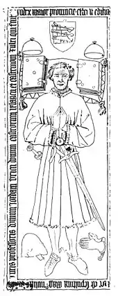 Jordanus Bricius, whose name is usual written in French as Jourdain Brice, was an important judge and legal scholar. He is believed to have died in either 1433 or 1439.[44][45] The historian Eugène Germer-Durand when reporting the discovery of the slab suggested that his family name may have been Brès which in the Provençal dialect is similar to the word for a type of trap used to catch birds.[46] This could explain the crest on the slab which includes a small bird above three objects that could be traps. Jourdain Brès may have been born locally as the family name of Brès existed in the neighbouring village of Laudun in the 17th century.[41]