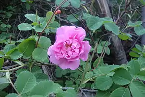 Rosa × damascena, more commonly known as the Damask rose,[1][2] or sometimes as the rose of Castile, is a rose hybrid, derived from Rosa gallica and Rosa moschata.[3] Further DNA analysis has shown that a third species, Rosa fedtschenkoana, is associated with the Damask rose.[4]