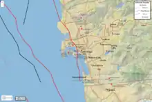 The Rose Canyon Fault is about 30 km (19 mi) in length. It starts in the Mission Valley area and heads past Mt. Soledad and La Jolla into the Pacific Ocean where it joins other faults such as the Oceanside Fault.[2]