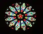 At Chartres, the transepts roses follow the style of the original 12th-century rose, elaborating on the theme of contrasting forms. The south rose combines the wheel with circles and semicircles, while the north rose introduces square lights which, rotating around the centre, are all set at different angles, creating a kaleidoscopic effect of great energy.[18]