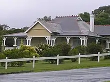 Rosemount is an imposing late Federation style residence located on a corner block of approximately 0.5 hectares in area at Saratoga. Set in landscaped grounds it has features of Californian bungalow style including its weatherboard construction, single gables and squat brick columns in its verandah. Part of Rosemount's landscaping consists of small sandstone block walls. The stone were originally hewn by convicts to build a house for the officer-in-charge of the area and were later moved to this site. Some citrus trees survive on the property.[1]