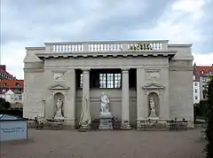 The Hercules Pavilion stands at the end of Kavalergangen and takes its name from a statue of Hercules positioned in a deep niche between two Tuscan columns. It is flanked by two smaller niches with statues of Orpheus and Eurydice. The three statues were made by the Italian sculptor Giovanni Baratta and acquired by Frederik IV during his visit to Italy.[3]