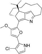 Roseophilin is an antibiotic isolated from Streptomyces griscovirides shown to have antitumor activity.[1] The chemical structure can be considered in terms of two components, a macrotricyclic segment and a heterocyclic side-chain. Several laboratory syntheses of roseophilin (e.g., those of Trost, Fürstner, Salamone) are based upon the Paal-Knorr synthesis, and two others are based on the Nazarov cyclization reaction (those of Tius, Frontier).