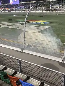 After running a race with JD Motorsports at Indianapolis, Chastain returned to CGR for the DC Solar 300 at Las Vegas Motor Speedway. He once again performed well throughout the weekend, securing the second-fastest time in final practice and the fifth starting spot for the race.[50][51] Once again the class of the field, Chastain led all but twenty of the 200 laps in the race and prevailed over Justin Allgaier for the victory, his first in over 200 starts in NASCAR.[52] True to his roots, Chastain smashed a watermelon on the track as a final victory celebration.[52] In a post-race media conference, he admitted to getting emotional in the closing laps of the race due to the gravity of the win.[53] With the win, a playoff berth was wrapped up, the first of his career.[54] Chastain also revealed that he was not being paid to drive the car, something that he claimed was reason for ridicule within the sport.[55] Chastain fell out of the playoffs after the opening round after Matt Tifft made a late-race rally at Dover, claiming the final spot by three points.[56]