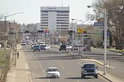 Roswell is located in the High Great Plains of southeastern New Mexico,[9] approximately 7 mi (11 km) west of the Pecos River and some 40 mi (64 km) east of highlands that rise to the Sierra Blanca range. U.S. Routes 70, 285 and 380 intersect in the city. US 70 leads northeast 111 mi (179 km) to Clovis and 117 mi (188 km) west to Alamogordo; US 285 leads north 192 mi (309 km) to Santa Fe and south 76 mi (122 km) to Carlsbad; and US 380 leads east 134 mi (216 km) to Brownfield, Texas, and west 164 mi (264 km) to Socorro.