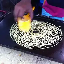 Roti jala, roti kirai or roti renjis (English: net bread or lace pancake; Jawi: روتي جالا) is a popular Malay and Minangkabau tea time snack served with curry dishes which can be found in Indonesia, Malaysia and Singapore.[2] The roti jala is a pretty dish that looks like a lace doily due to the way it is made. This is a very traditional Malay dish that is usually homemade and served at events such as weddings and festivals. It is usually eaten in sets of three to four pieces with curries, especially chicken curry, as a substitute to rice.[3]