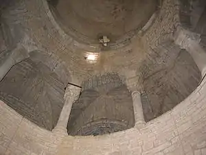 The interior has eight columns in a circle creating two concentric spaces. The wall enclosing them has niches marked by semi-columns with elegant capitals. Traces of frescoes can still be seen.