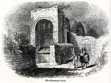 The castle continued to be repaired at intervals until the early 14th century; the last recorded repair to the defences being in 1352. By c.1500 the original gateway was out of use, and its entrance blocked up, in favour of an adjacent archway.[19] In the northernmost corner of the castle there was a sally port beneath a large tower and a drawbridge over the ditch outside the wall.[20] These were destroyed in 1774 and no trace now remains.[21]