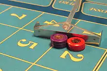 Croupier's rake pushing chips across a roulette layout