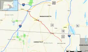Route 131 is a 13.55-mile-long (21.81 km) state highway in the U.S. states of Massachusetts and Connecticut. It serves the southwestern portion of the Worcester metropolitan area. It begins at Route 12 in the North Grosvenor Dale section of the town of Thompson in Connecticut and ends at U.S. Route 20 in the center of Sturbridge in Massachusetts.