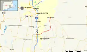 | Massachusetts | Hampden | East Longmeadow | 2.17 | 3.49 | Northern terminus; 5 Corners rotary; northern terminus of Route 186 | |