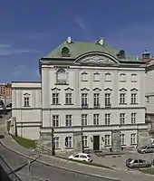 The Copper-Roof Palace has since 1989 been a branch of the Royal Castle Museum.[27] The palace is contiguous with Warsaw's Royal Castle, and down a slope from the Castle Square and Old Town. It was originally a patrician house of Wawrzyniec Reffus, it was built 1651–1656.[28] After 1657 destruction by the army of George II Rákóczi, it was completely remodeled in 1698–1701[9] for Jerzy Dominik Lubomirski.[28]
