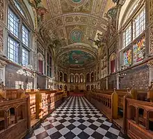 Sir Nikolaus Pevsner called the original college building "the most ebullient Victorian building in the Home Counties", and noted that together with its sister building the Holloway Sanatorium, it represents "the summit of High Victorian design". The Founder's Building, which is now Grade I listed,[12] was officially opened in 1886 by Queen Victoria,[8] who allowed the use of "Royal" in the college's name.[13][14] Founder's has been described by The Times as "one of Britain’s most remarkable university buildings", largely for its elaborate architecture,[15] and according to The Sunday Times it "makes the college instantly recognisable".[11] The college also has a Chapel, completed in 1886 as one of the last parts of the university to be finished.[16] October 1887 saw the arrival of the first 28 students at Royal Holloway College.[16] It later became a constituent of the University of London in 1900, as did Bedford College, which eventually merged with Royal Holloway College.[8]