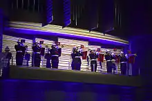 Closeup of buglers from the Band of HM Royal Marines Scotland performing in front of the National Museum of the Marine Corps, 2009.