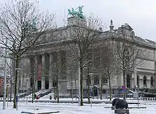 The neoclassical building housing the collection is one of the primary landmarks of the Zuid district of Antwerp. The majestic building was designed by Jacob Winders (1849–1936) and Frans van Dijk (1853-1939), built beginning in 1884, opened in 1890, and completed in 1894. Sculpture on the building includes two bronze figures of Fame with horse-drawn chariots by sculptor Thomas Vincotte, and seven rondel medallions of artists that include Boetius à Bolswert, Frans Floris, Jan van Eyck, Peter Paul Rubens, Quentin Matsys, Erasmus Quellinus II, and Appelmans, separated by four monumental sculptures representing Architecture, Painting, Sculpture, and Graphics.