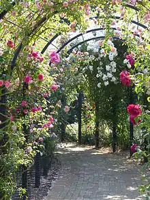 The Royal National Rose Society Gardens, also known as The Gardens of The Rose, were the gardens and headquarters of The Royal National Rose Society at Bone Hill, Chiswell Green, St Albans, Hertfordshire in the United Kingdom. The Royal National Rose Society was established in 1876 and the gardens were opened over 50 years ago by Mary, Princess Royal who was a Patron of the society at the time. The Society's stated aim was to create a "living dictionary" of roses. The gardens contain 2,500 different rose cultivars among 15,000 rose bushes.