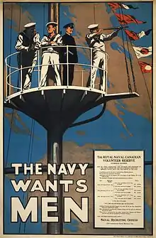 As volunteer numbers grew, an Overseas Division was created in February 1916 to recruit Canadians for service with the Royal Navy.[3] Recruiting for this division was divided into nine districts, headquartered in the provincial capitals except in British Columbia, where the headquarters was in Vancouver.[9] By early 1917, roughly 1,200 men had been shipped to the United Kingdom.[3] Though 5,000 men had been authorized, by the end of the war, only 1,700 volunteers were enrolled into the Overseas Division, a number that was limited after the East Coast Patrol along Canada's Atlantic Coast became the focal point of the Canadian naval reserve.[3][9]