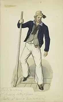 Lord Anson first issued uniform regulations for naval officers in 1748; this was in response to the naval officer corps wishing for an established uniform pertaining to their service.[1] Officer uniforms were at first divided into a "best uniform", consisting of an embroidered blue coat with white facings worn unbuttoned with white breeches and stockings, as well as a "working rig" which was a simpler, less embroidered uniform for day-to-day use.