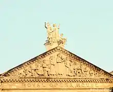 The Opera House is built in a mixed classical design featuring a blend of European and Indian architectural styles. The design was conceived in 1908 by Maurice Bandmann, an entertainer from Kolkata and his partner Jehangir Framji Karaka, who was the head of a firm of coal brokers.[11] It was built with exquisite Italian marble on a leased land close to the Kennedy and Sandhurst bridges. Although the work was completed in 1912, several additions were made until 1915. The pediment figure at the pinnacle was substituted with three cherubs. A pair of unique crystal chandeliers, called the ‘Sans Souci’ were donated by the David Sassoon family. The chandeliers, which were earlier located in the Sassoon mansion, were shifted to the foyer of the opera house. At the main entrance, the dome is segmented into eight different parts "as a tribute to poets, dramatists, novelists, literati and people from art and culture." The original interior of the opera house consisted of orchestra stalls with cosy cane chairs. Behind the stalls were 26 rows of boxes with couches. The seating enabled a clear view of the stage to all the people seated in the stalls and in the Dress Circle. The acoustics were of the opera house were created by shaping the ceiling in a manner that permitted distinct audibility that allowed the audience seated in the gallery to hear every word or song from the stage. The entrance was originally designed with a frontage for carriages to drive in.[1][3][8][12]