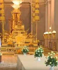 The Throne Hall is where the king's confidants, generals and royal officials once carried out their duties. It is still in use today as a place for religious and royal ceremonies (such as coronations[2] and royal weddings) as well as a meeting place for guests of the King. The cross-shaped building is crowned with three spires. The central, 59-metre spire is topped with the white, four-faced head of Brahma. Inside the Throne Hall contains three royal thrones (one is more of western style and the other two are traditional) and golden busts of Cambodians kings and queens starting from the reign of King Ang Doung onwards. This Throne Hall is the second to be built on this site. The first was constructed in 1869-1870 under King Norodom. That Throne Hall was demolished in 1915. The present building was constructed in 1917 and inaugurated by King Sisowath in 1919. The building is 30x60 metres. As with all buildings and structure at the Palace, the Throne Hall faces east and is best photographed in the morning. When visiting note the thrones (Reach Balaing in front and Preah Thineang Bossabok higher at the back) and the beautiful ceiling frescoes of the Reamker. To the north of the thrones stands the statue of His Majesty Sisowath Monivong standing holding the Royal Sword. The statue is made with gold and shows him dressed in casual clothes. While to the south of the thrones stands the gold statue of His Majesty King Sisowath sitting on the Preah Thineang Bossabok dressed and covered with the Royal Regalia of Cambodia (as you can see he is wearing the Crown, the Sopourna Bat or the royal footwear and in his right hand holds the Royal Sword. He sits on the Preah Thineang Bossabok which is made to look like the real one to the right.