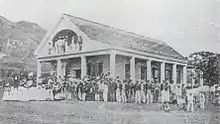 It was run by Amos Starr Cooke and Juliette Montague Cooke from the American Board of Commissioners for Foreign Missions.[5] It was a long, two-story frame building with a large dining room and separate sleeping quarters for the children and for the Cooke family. There was also the New England parlor, furnished with handmade and treasured furniture sent from home, and with much brought from China. It resembled nothing Hawaiian in its appearance nor its atmosphere. The royal children were taught how to act like Americans and to speak like Americans. The Hawaiian kahu (traditional caretaker of children) John Papa ʻĪʻī was selected as assistant teacher.[2]:291