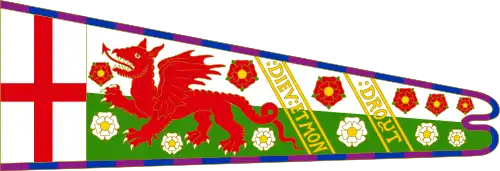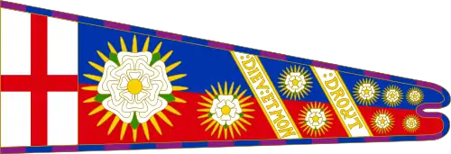The St George's Cross in the hoist. Azure and gules, bordered murrey and azure. A White rose of York, barbed, seeded, and irradiated or, in base a rose argent, barbed, seeded, and irradiated or. DIEU ET MON. In chief a rose argent, and in base another. DROYT. Five roses argent, three in chief, and two in base. | ||