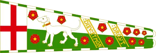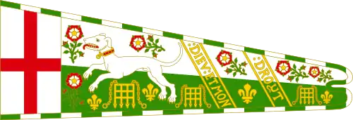 The St George's Cross in the hoist. Argent and vert. A White Greyhound of Richmond, statant argent, collared gules. between roses, barbed, seeded gules. DIEU ET MON. In chief a rose gules, and in base another. DROYT. Five roses gules, three in chief, and two in base. | ||