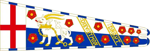 The St George's Cross in the hoist. Azure and gules, bordered murrey and azure. A White boar of Richard III, between roses argent, barbed, seeded, and irradiated or, LOYAUTE. In chief a rose argent, and in base another. ME LIE. Five roses argent, three in chief, and two in base. |