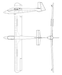 The more obvious external difference between the two prototypes was in their tails. The P1 had a V-tail with its metal-framed, fabric-covered surfaces set 90° apart. Overall, these surfaces were roughly quadrantal, with straight leading edges. Trapezoidal fixed surfaces occupied 30% of the surface and balanced control surfaces the rest. The P2 had a conventional tail with dural-covered fixed surfaces and fabric-covered control surfaces. The fin was trapezoidal and the rudder angular. The high aspect ratio tailplane was rectangular in plan, with tapered elevators.[1][2][3]