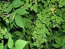 Rubus strigosus, the American red raspberry or American raspberry, is a species of Rubus native to much of North America. It has often been treated as a variety or subspecies of the closely related Eurasian Rubus idaeus (red raspberry or European red raspberry),[1][2] but currently is more commonly treated as a distinct species.[3][4][5] Many of the commercial raspberry cultivars grown for their fruit derive from hybrids between R. strigosus and R. idaeus; see Raspberry for more details.