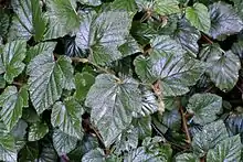 Leaves are alternate (each leaf arises at a different node).[3] Leaf shape is simple (undivided blade) or slightly undulate (3-5 shallow lobes), ovate to oblong, with base subrounded to cordate and apex shortly acuminate (see: Leaf shapes).[8][9][12] More simply, leaves have a heart-shaped base and a pointed tip.[3] The margins of the leaf are described as unevenly coarsely sharply serrate (see: Leaf margin). Leaves are approximately 6–12 by 3–8 cm in size. On the abaxial (under) surface, the colour is yellow-grey and there are bristles, particularly on the veins which are raised. Adaxially (upper surface), the leaf is dark green, glossy and mostly glabrous (hairless) with only sparse bristles between veins.[8]