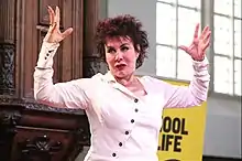 Ruby Wax OBE (née Wachs;[1] born 19 April 1953)[2] is an American-British actress, comedian, writer, mental health campaigner, and lecturer. A classically trained actress, Wax starred in the sitcom Girls on Top (1985–1986), and came to prominence as a comic interviewer, playing up to British perceptions of the strident American style, in shows including The Full Wax (1991–1994), Ruby Wax Meets... (1994–1998), Ruby (1997–2000), and The Ruby Wax Show (2002). She went on to become the script editor for the BBC sitcom Absolutely Fabulous (1992–2012), also appearing in two episodes.