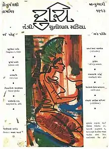 Madia himself wrote a column Chhindu Kholta under pen name Akho Rupero. He also wrote on social issues in Bahyantar column. He had also written on several prominent personalities and authors in it such as Virchand Gandhi, Krishnaji Holaji Aara, Abdul Rahim, Apabhai Almelkar, Jayant Khatri, Ishwar Petlikar, Umashankar Joshi, Albert Camus, Jean-Paul Sartre, Henry Miller, Behramji Malabari, Octavio Paz, Karl Marx, Shayda , Jhaverchand Meghani, Jyotindra Dave, Dhoomketu, Samuel Johnson, Dag Hammarskjöld, Yevgeny Yevtushenko, Mikhail Sholokhov, Romain Rolland, Boris Pasternak, Leo Tolstoy, Anton Chekhov, Ernest Hemingway, D. H. Lawrence as well as on modern literature. Vadilal Dagli wrote a column Mumbai-ni Diary focused on Mumbai and issues of India. Jayant Pathak published his autobiography Vananchal in serial. Manubhai Pancholi's novel Kurukshetra was started in it but stopped after some episodes. Alan Paton's play, Cry, the Beloved Country was translated by Madia as Bhom Rade Bhenkar which stopped after just three episodes. Several other writers published criticism, essays and works on authors in it.[1] The cover art and other art in magazine were drawn by various artists such as Raghav Kaneria, Abhay Khatau, K. K. Hebbar, Krishnaji Holaji Aara, Abdul Rahim, Apabhai Almelkar, Bhanu Shah, Leena Sanghvi, Dinesh Shah, Chhaganlal Jadav, Jyoti Bhatt, Laxman Pai, Shyavaksh Chavda, Sudhir Khastagir, Raju. Indradev Acharya and Bansilal Verma ‘Chakor' published cartoons in it.[1]