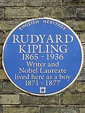Kipling's days of "strong light and darkness" in Bombay ended when he was five.[24] As was the custom in British India, he and his three-year-old sister Alice ("Trix") were taken to the United Kingdom – in their case to Southsea, Portsmouth – to live with a couple who boarded children of British nationals living abroad.[25] For the next six years (from October 1871 to April 1877), the children lived with the couple – Captain Pryse Agar Holloway, once an officer in the merchant navy, and Sarah Holloway – at their house, Lorne Lodge, 4 Campbell Road, Southsea.[26]