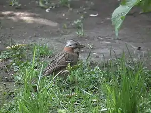 The rufous-collared sparrow feeds on the ground on seeds, fallen grain, insects and spiders. It will sometimes join mixed-species feeding flocks and has been observed to pick termites from spider webs.[4][5][6] It is usually seen in pairs which hold small territories, or in small flocks. Tame and approachable, it is common throughout its large range and not considered threatened by the IUCN.[1]