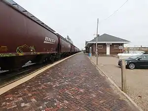 ![]() The Amtrak station in Rugby with a BNSF Railway freight train in the station. | ||||||||||||||||||