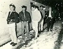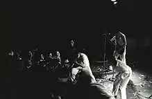 As teenagers inspired by the eruption of the American and British punk movement, the Wallis brothers and Adams began writing songs together around 1978. Several songs that became fixtures of Ruin's performances date to this early period, including their revved-up covers of Leonard Cohen.[1][lower-alpha 1] In what became a hallmark of Ruin, the early Wallis-Adams songs, while loyal to the hyper-rhythms and aggressive delivery of early punk and later hardcore, were just as likely to evoke the melancholia of American folk music or the frantic jam quality of psychedelic rock.[1] Incoming bassist Cordy Swope added elements of 1960s British invasion and American underground art rock to the band's mix of styles.[2] This eclecticism became a defining feature of the Philadelphia underground music scene of the 1980s and beyond, an environment that contributed to Ruin's success.[3][4][5] American author and urbanist Adam Greenfield noted: "Philadelphia threw nothing but curveballs. McRad, The Dead Milkmen, Pagan Babies, Scram: none of them quite fit the template, somehow. They were too weird, too goofy, too unpredictable, too hard to fit into the categories that were already then beginning to solidify."[6] Illustrating Ruin's own eclecticism, Greenfield adds, "Which brings us at last to Ruin...If you were lucky enough to see them play, you never forgot it. There were rugs. There were, no lie, candles. The band filtered onto the stage dressed in white from head to toe. The message was unmistakable: whatever it was you were about to witness, it wasn’t going to be yet another clutch of Black Flag wannabes, sounding off about their petty beefs with still pettier authorities."[7]